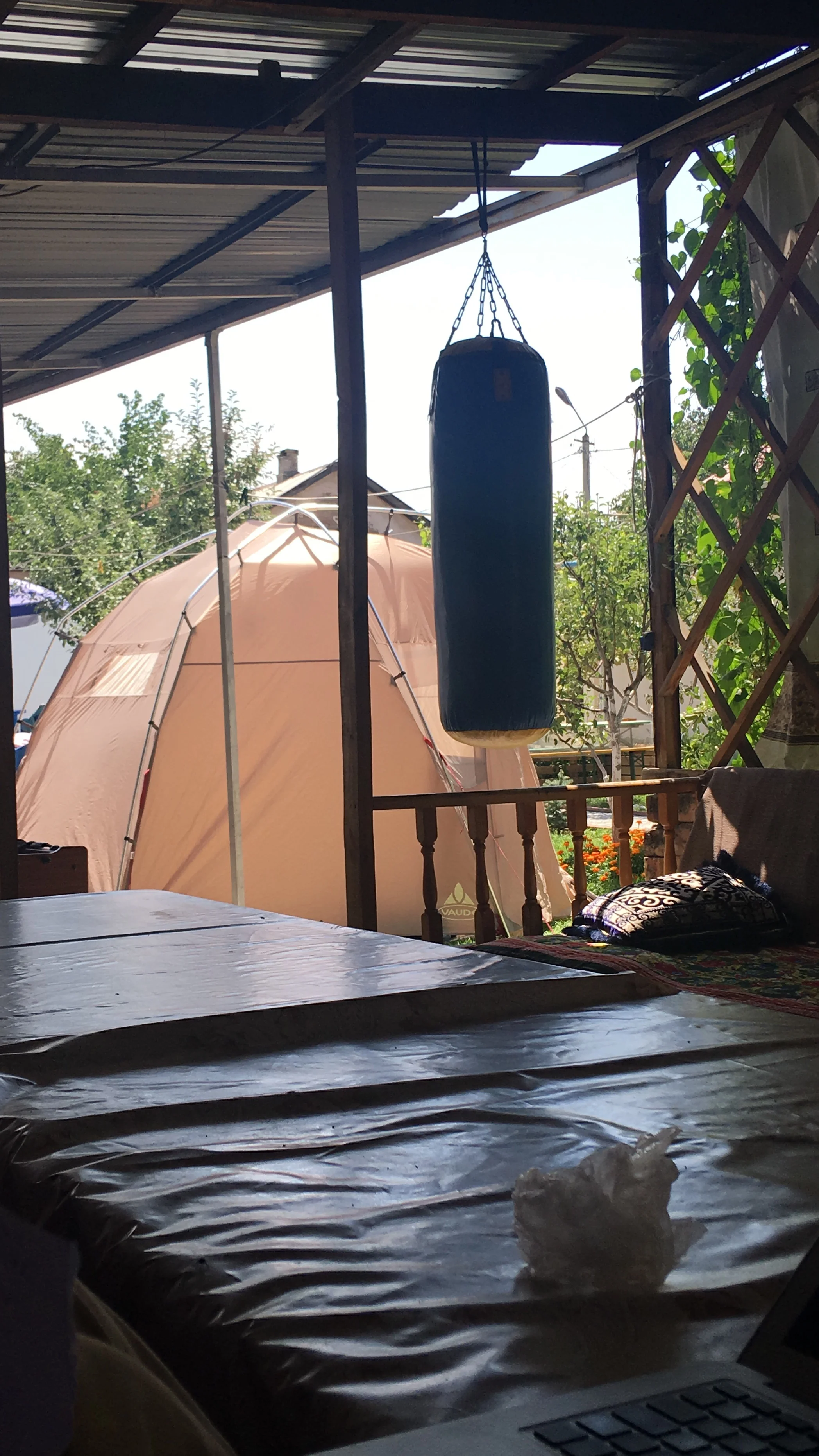 The following morning, we dismantled our very tall capacious tent, leaving the scars of our extended occupation on the Tunduk lawn and Jim exhausted himself in the early morning heat to carry all our belongings to stow away in the Tunduk lock up, including our mattress which was now stained from an impossibly heavy rain storm which had seeped soggily under our tent which has no built in ground sheet only a large polythene sheet.