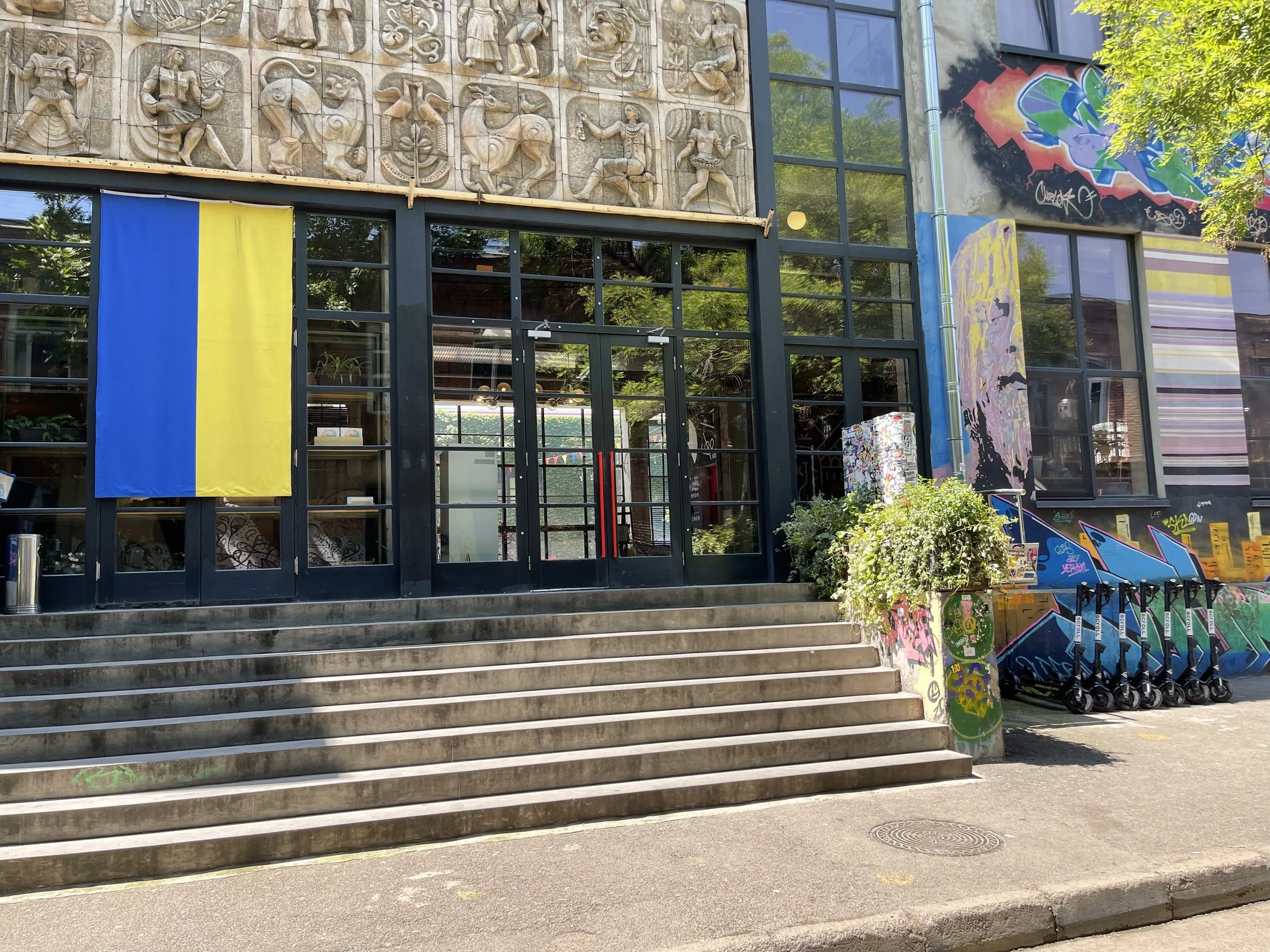Entrance to Fabrika Hostel with Ukrainian flag