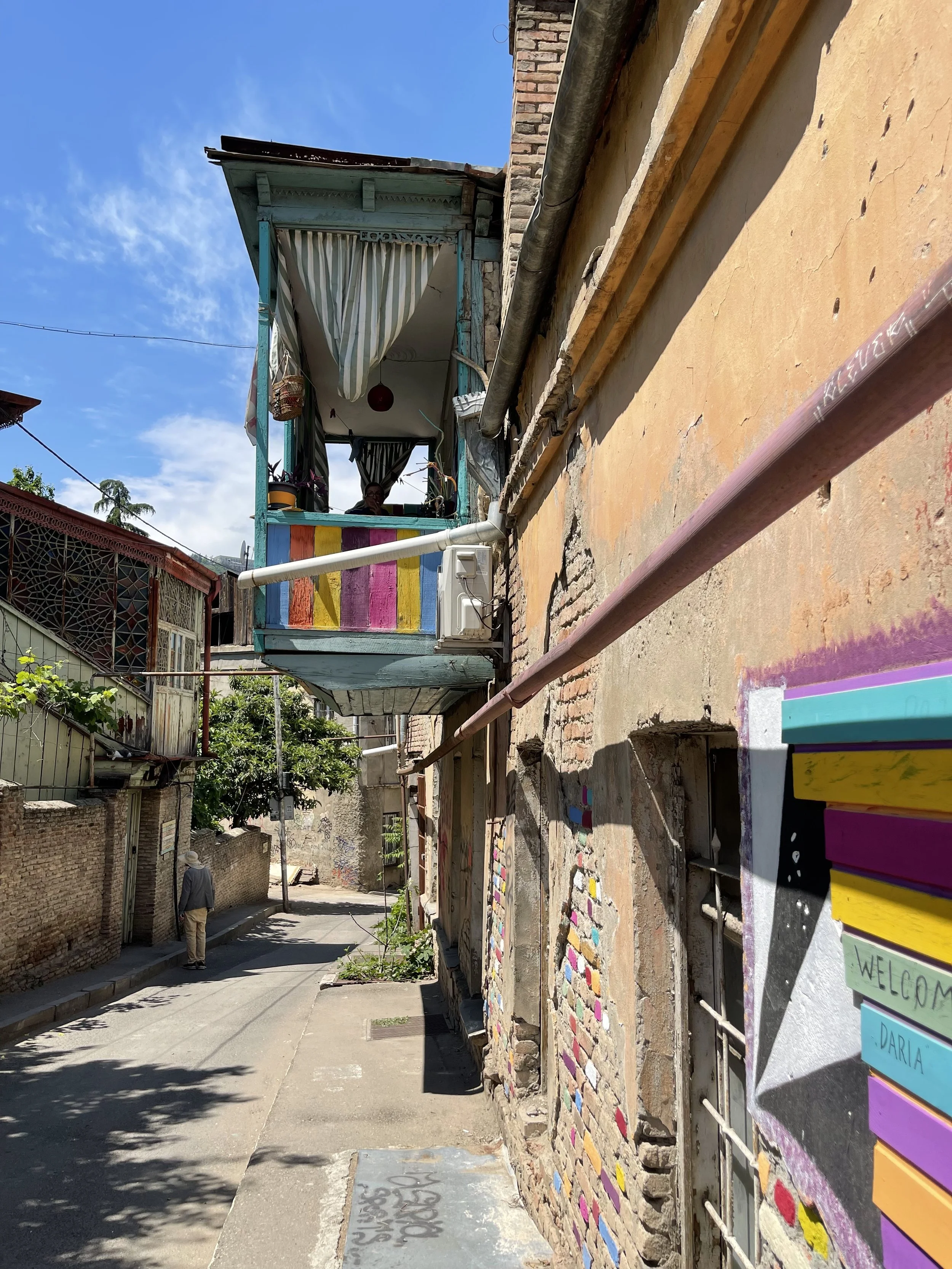 We actually met young people who had arrived from Ukraine, Russia and Belarus to live and work in Georgia where they have received a welcome. Fabrika was teeming with young people working remotely on laptops, having zoom meetings and drinking coffee. We imagine that many of these had come recently from Ukraine, Russian and Belarus. Russian vehicles in Georgia prominently displayed anti war stickers. The town is home to theatre groups and artists and we saw quite a bit of really good street art.