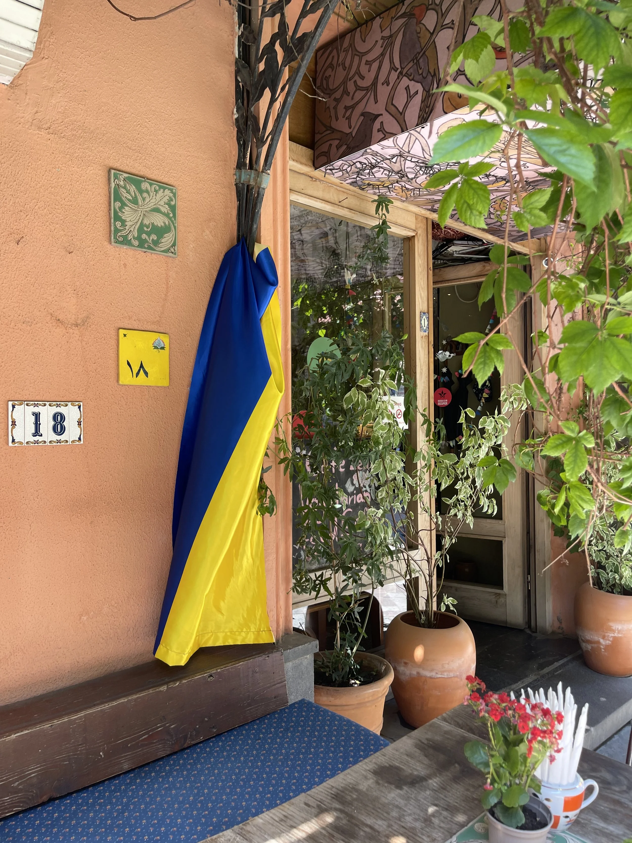 Ukrainian flag outside Georgian cafe